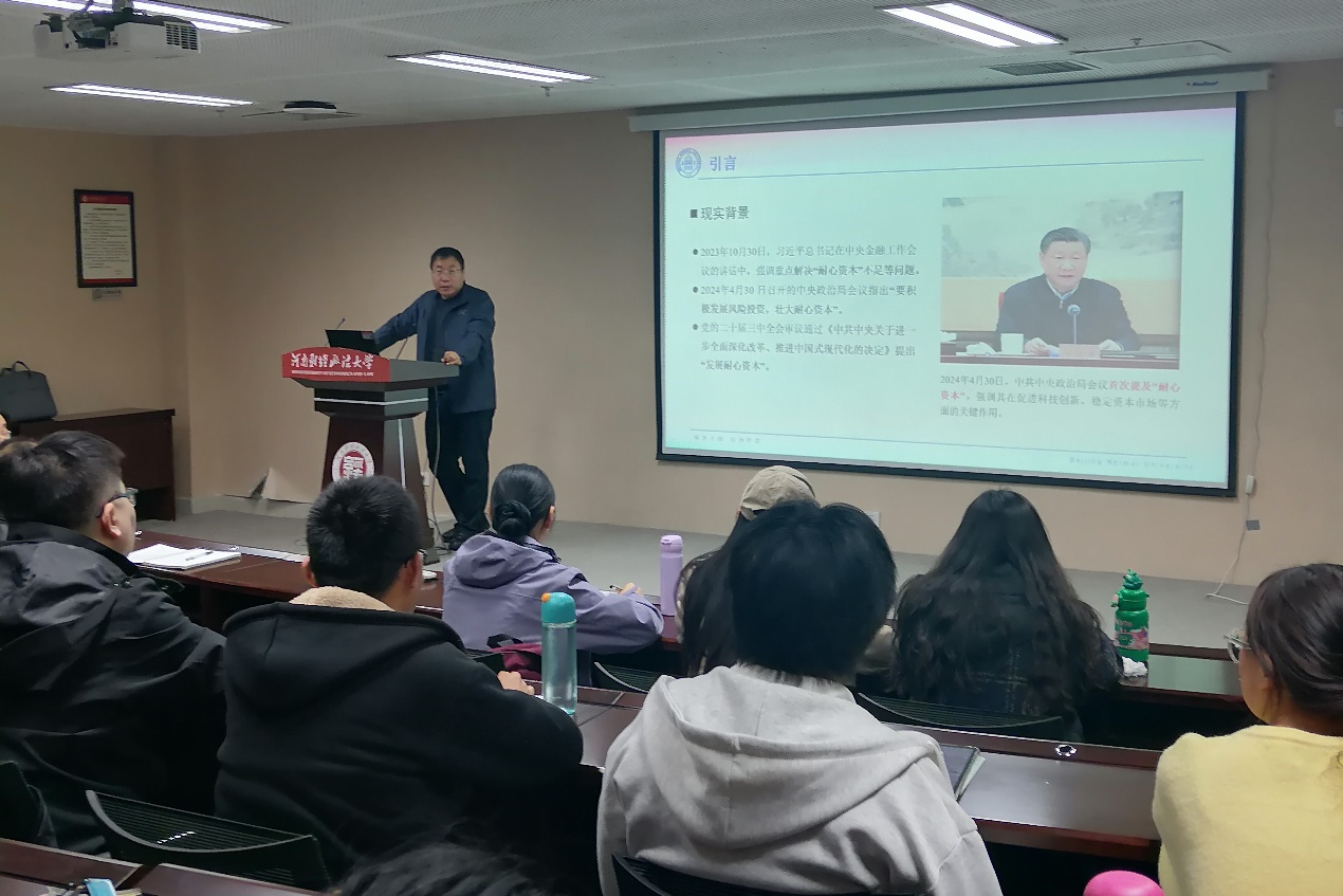 胡海峰教授深入剖析了耐心资本的内涵特征,详细分析了影响耐心资本形成的因素,强调了这些因素如何相互作用,共同塑造了耐心资本的发展态势。在社会经济效益方面,胡教授通过丰富的案例和数据,展示了耐心资本在推动企业创新、促进产业升级以及稳定金融市场等方面的显著贡献,使在场师生对耐心资本的实际价值有了更直观的认识。最后,他对耐心资本的未来发展进行了展望,提出在当前复杂的经济形势下,进一步培育和壮大耐心资本将是金融领域的重要研究方向之一。