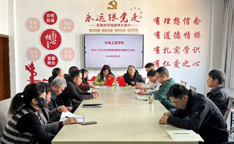 严明教风学风强化纪律管理——机电工程学院召开春季学期全体教职工会议2026年3月3日下午,机电工程学院在兴业楼301会议室召开2025-2026学年春季学期全体教职工会议。围绕...