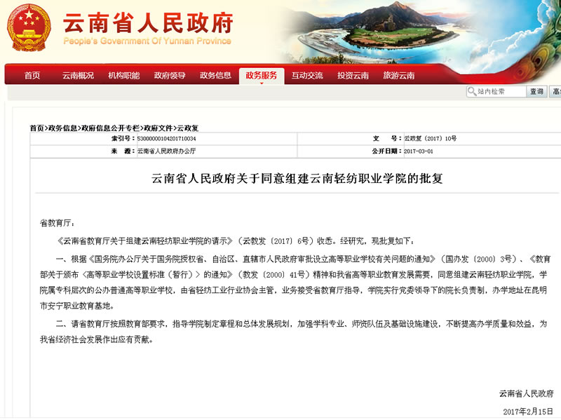 一、根据《国务院办公厅关于国务院授权省、自治区、直辖市人民政府审批设立高等职业学校有关问题的通知》(国办发〔2000〕3号)、《教育部关于颁布〈高等职业学校设置标准(暂行)〉的通知》(教发〔2000〕41号)精神和我省高等职业教育发展需要,同意组建beat365英国官方网站,学院属专科层次的公办普通高等职业学校,由省轻纺工业行业协会主管,业务接受省教育厅指导,学院实行党委领导下的院长负责制,办学地址在昆明市安宁职业教育基地。