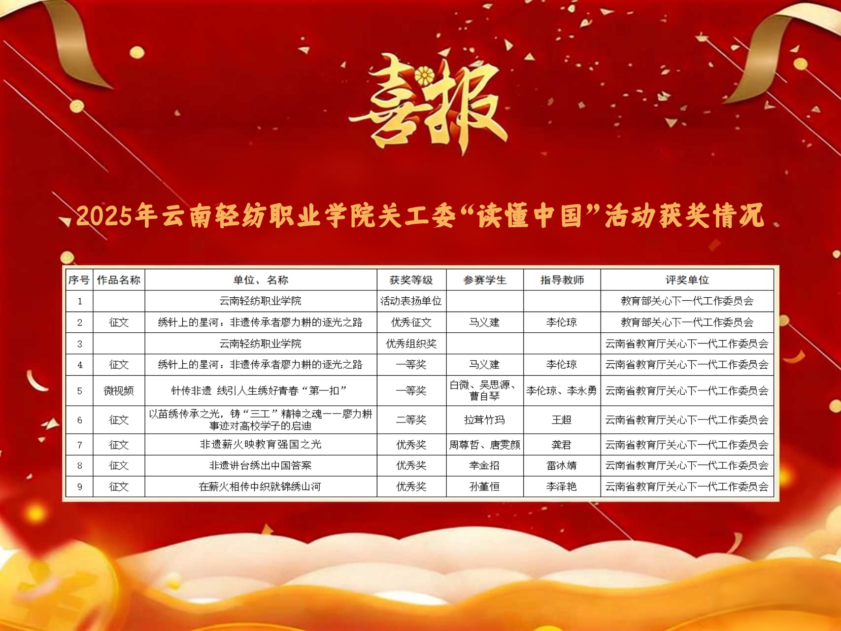 此次评选,beat365成果丰硕。学校获评教育部“读懂中国”活动表扬单位与云南省“读懂中国”活动优秀组织奖,双重荣誉彰显组织实力;征文《绣针上的星河:非遗传承者廖力耕的逐光之路》喜获部级优秀征文与省级一等奖,成为本次活动的亮眼佳作。此外,省级奖项收获颇丰,微视频《针传非遗线引人生...